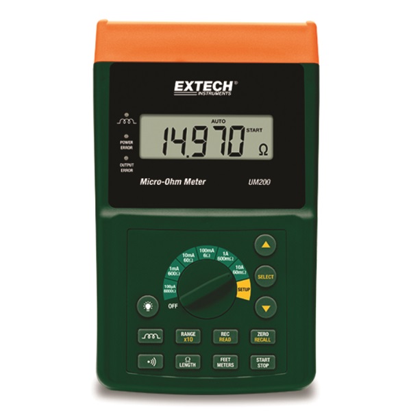 The Extech UM200 is a precision Micro-Ohm Meter which features a resolution down to 1 µΩ. The UM200 has 6 ranges with 3 sub-ranges in each current range. It features a 5-Digit backlit LCD, PC interface, auto or manual ranging, and a 10 A maximum test current. Store/Recall up to 3000 measurements. Complete with 4-wire cables with Kelvin clip connectors, rechargeable Li-Polymer battery, AC adapter/charger, software and USB cable, and soft carrying case.