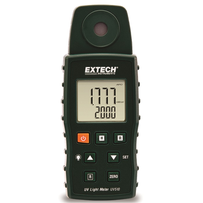 The Extech UV510 Light Meter measures UVA light radiation from natural and artificial light sources. It offers a backlit dual display, cosine corrected sensor, two selectable ranges, zero function, min/max recording, display hold, and auto power off. The compact size with handy wrist strap gives you convenience in taking quick UV reading wherever you go.